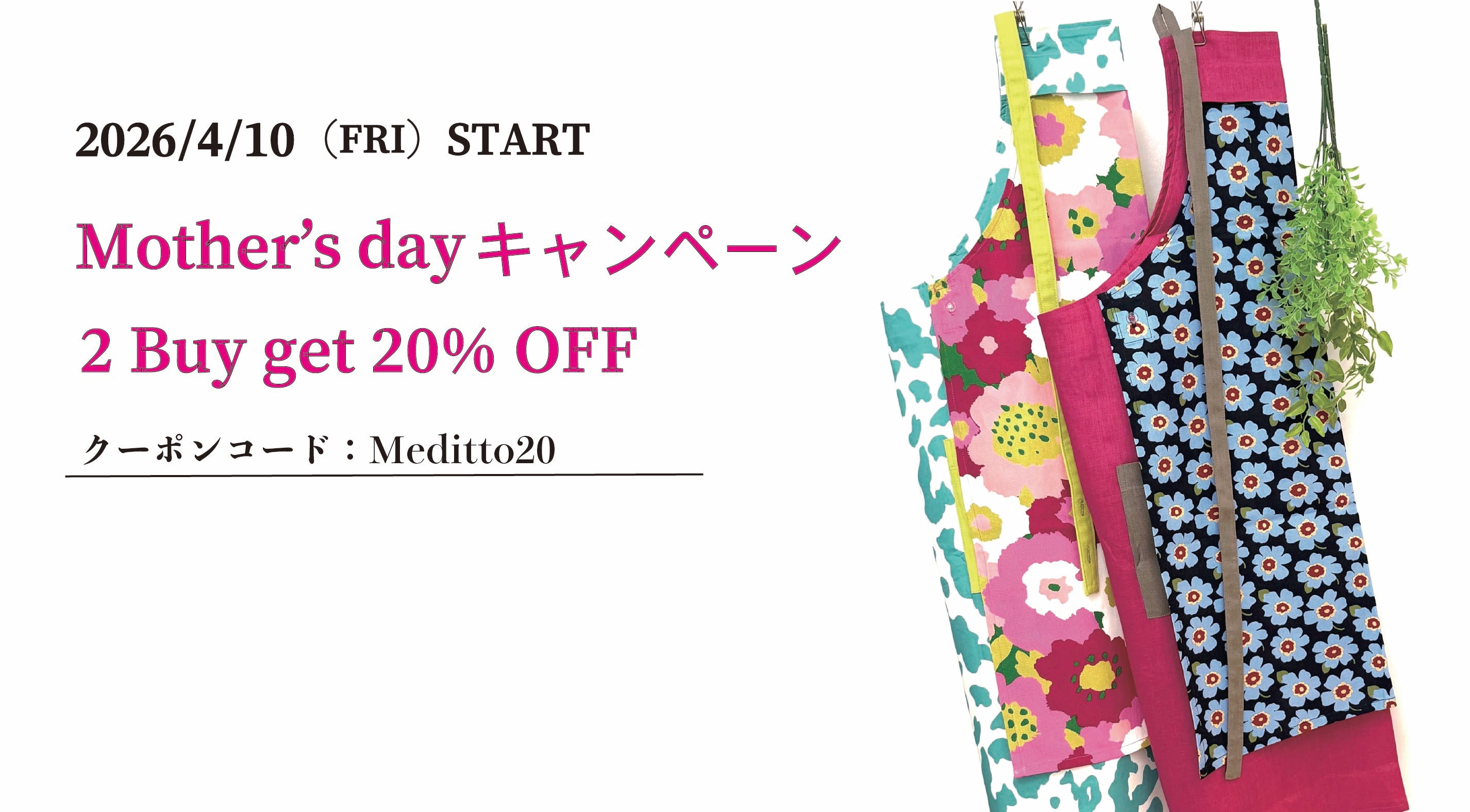 ✨ キャンペーンのご案内 ✨ 「Meditto」より、母の日に合わせた特別なキャンペーンを開催のお知らせです。 「Meditto」商品を2点以上ご購入で合計金額から20%OFF ※ギフトセット・ギフトボックスは対象外 エプロン・付け替えカバー・キッチン雑貨など、組み合わせは自由にお選びいただけます。 ------------------------- 📅開催期間 2026年4月10日 ~ 5月13日 ------------------------- ◾️クーポンコード : Meditto20 ------------------------- 🎫クーポンご利用方法 オンラインショップへアクセス お好きな商品をカートに追加 ご購入画面でクーポンコードを入力 ※他の割引との併用はできません ------------------------ 🎁組み合わせで広がる、贈り物の楽しさ 今回のキャンペーンは、2点選ぶことでお得になる内容です。 そのため、贈り物としても選びやすく、組み合わせを考える楽しさも広がります。 例えば… ・エプロン+付け替えカバー・エプロン+ミトン・キッチンクロス+小物アイテム など、用途や相手に合わせて自由にお選びいただけます。 -------------------------...